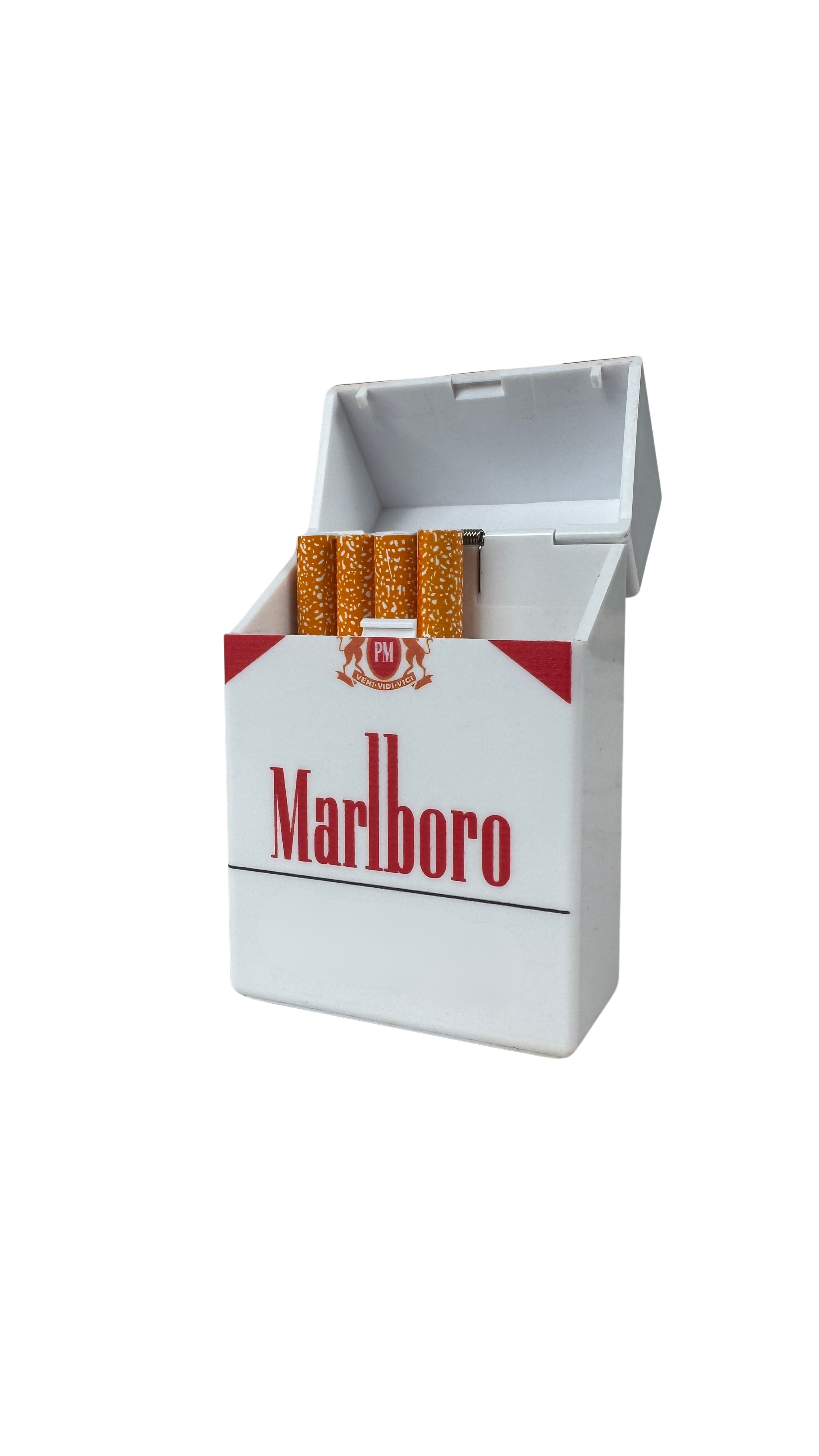 Thi Ledner Item is as described. I was afraid the "marlboro" would be wrongly printed but it is correctly printed. The "cigarettes" are made out of a metallic material, and it comes with three packets of bubble product. This is for a gift so i can't test it out but item has been received quickly and is as described!
